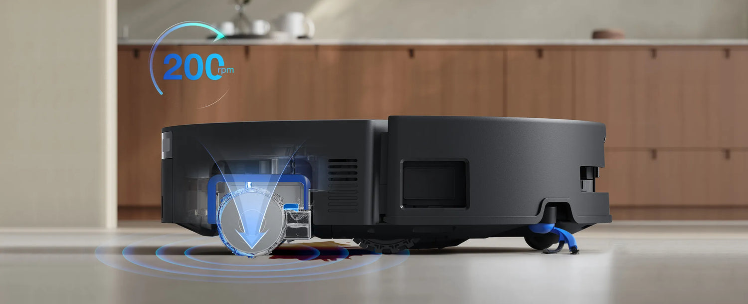 <br> removing stains from the floor, with a mopping pressure intensity of 3,700Pa, which is more than 16*ΒΉ times the pressure of traditional dual-plate mopping <br> and vibrating flat mopping. The clean water is delivered back to the mop to keep the mop renewed after the wastewater is scraped off. With up to 200 <br> rpm rolling speed, this equates to 200 high-speed scrubbing and rinsing actions per minute, effectively preventing streaks and cross-contamination. With <br> a smaller contact area, the mop contains more concentrated pressure to achieve a significant cleaning effect on stains.