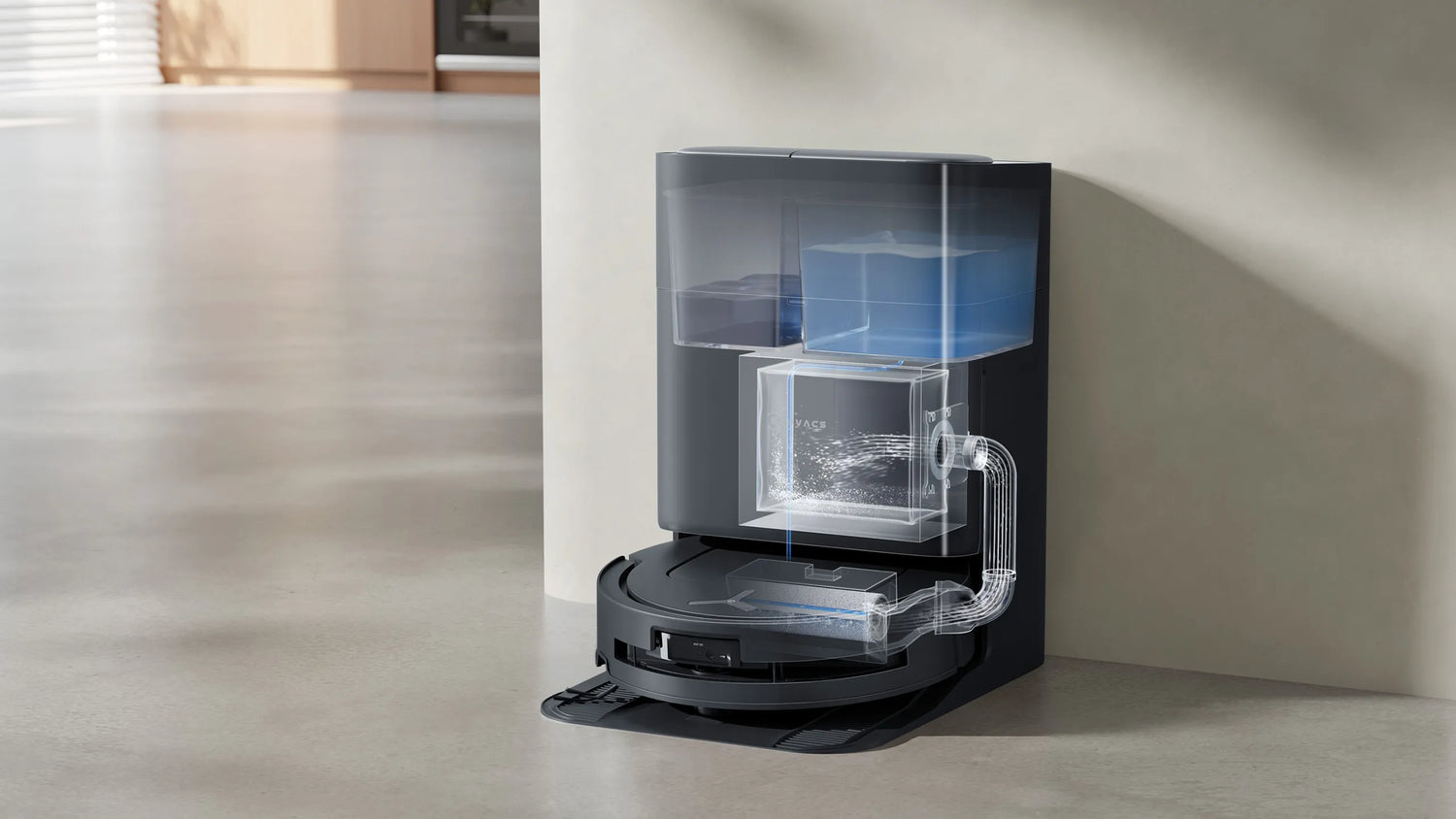 Automated vacuum cleaner and mop with edge cleaning, anti-tangle brushes, AI Instant Re-Mop, and 3D sensors that detect obstacles and avoid pets.